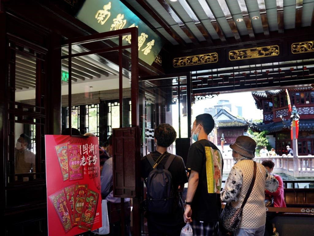 2020年5月12日,在上海豫園南翔饅頭店門口,消費(fèi)者從“國(guó)潮”廣告牌旁經(jīng)過(guò)。新華社記者 劉穎 攝