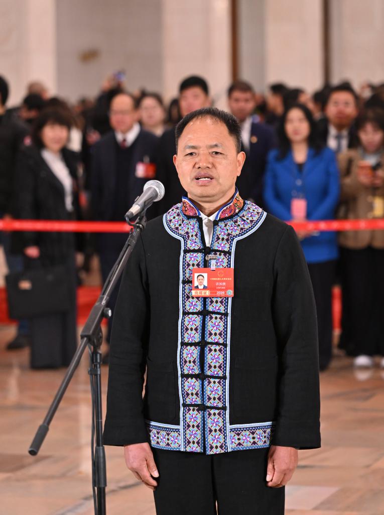 3月5日,第十四屆全國(guó)人民代表大會(huì)第四次會(huì)議首場(chǎng)“代表通道”集中采訪(fǎng)活動(dòng)在北京人民大會(huì)堂舉行。這是全國(guó)人大代表農(nóng)加貴接受媒體采訪(fǎng)。