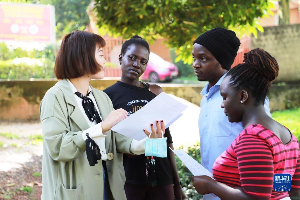 2022年4月19日,在烏干達(dá)首都坎帕拉,麥克雷雷大學(xué)孔子學(xué)院中文教師王夢(mèng)云(左)與學(xué)生進(jìn)行交流。新華社記者張改萍攝
