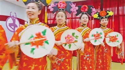 這是呼和浩特市新城區(qū)文化館老年滿族太平鼓舞隊表演時的一個場景。
