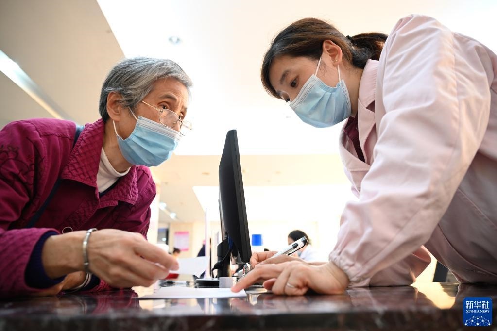 福建省三明市第一醫(yī)院醫(yī)保辦工作人員(右)向前來(lái)咨詢藥品報(bào)銷問(wèn)題的居民講解相關(guān)政策(2020年11月18日攝)。新華社記者 姜克紅 攝