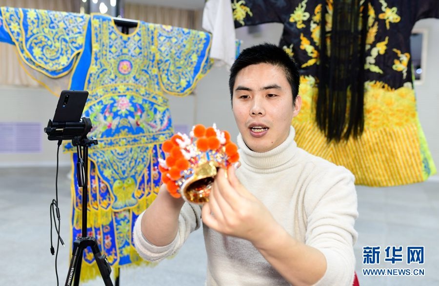 4月19日,內(nèi)蒙古婦女兒童中心少兒京劇班教師崔猛通過網(wǎng)絡(luò)直播平臺為學(xué)生介紹戲曲工藝品制作技藝。 -